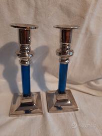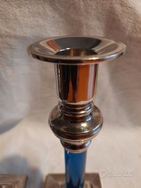coppia candelabri moderni. Metallo argentato e asta blu. Altezza cm.19. Base cm.7x7. Molto eleganti. Perfetti.