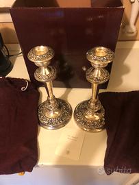 Vendesi due candelabri Old Sheffield Reproduction Fani Nell scatola originali Mai esposti Sacchetto singolo in panno Altezza 26 cm