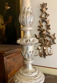 Antico candelabro della seconda metà del 1700 ( luigi XVI), realizzato in legno intagliato e argentato a mecca. Condizioni eccellenti, uniche sbeccatire della mecca dei piedini. Misure: altezza 94cm, diametro alla base 24cm circa.