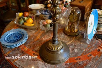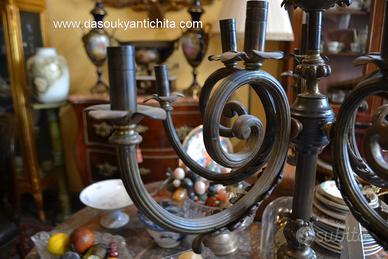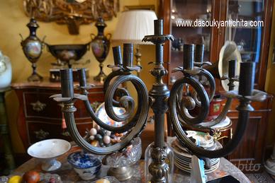 Antico candelabro del XX secolo di grandi dimensioni, realizzato in bronzo e ottone , provvisto di cinque braccia e 11 portacandele, presenta una struttura elaborata con bracci ricurvi e decorazioni a volute che si estendono dalla colonna centrale,