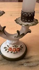 Piccolo candelabro vintage a due bracci, realizzato in ceramica con decorazioni floreali dipinte a mano e dettagli in verde sottobosco.Stile classico. Include eleganti inserti in metallo traforato per l'alloggiamento delle candele ( candele incluse).Perfetto come centrotavola per cene eleganti o come elemento d'arredo per amanti del vintage. Ritiro a mano a Pozzallo ( RG)o spedizione a carico dell'acquirente.