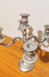 Bellissimo candelabro a 5 bracci, misura 30x30cm circa. Non capisco bene il materiale,sembra qualche tipo di metallo dipinto di color argento. È abbastanza pesante. I bracci ruotano, perché si possono aprire totalmente come in foto o tenere più ravvicinati.