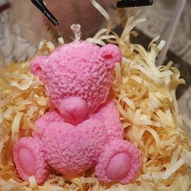 Candela artigianale in cera di soia 100% naturale, a forma di orso che tiene un mazzo di fiori. Un'idea originale per decorare la tua casa o per fare un regalo speciale.