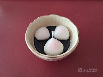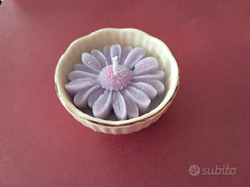 Candele profumate fatte a mano, all'interno di una graziosa ciotolina di ceramica color panna con profilo dorato. Disponibili in varie forme e colori. Euro 6 cad.
