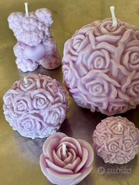Candele realizzate a mano con cera di soia, in diverse forme decorative (orsi, alberelli, pupazzi di neve, rose e gnomi).