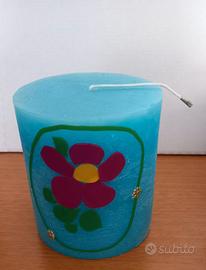 Tris di candele decorate e decorative, verde, azzurra e lilla, alte circa 10/11 cm. con diametro 10.