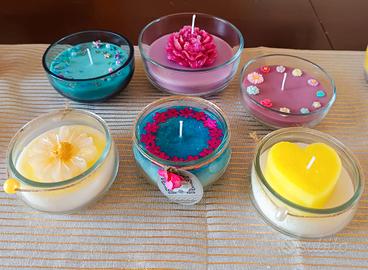 candele bio fatte a mano con cera di soia di alta qualità,fiori secchi pressati, oli essenziali profumati,oggetti decorativi,coloranti. stampini in paraffina decorati e profumati. candele in gel grazie all alta qualità della cera bio durano di più,non fanno fumo e non inquinano l ambiente anzi,lo decorano e lo profumano nel modo più naturale prezzi a partire da euro 3 a salire. stampi cera rosa e tulipano euro 3 stampi cera Margherita,rosa grande, tris fiori e cuori euro 4 stampi cera elfi piccoli euro 8 elfi grandi euro 10 stampi cera orsetti euro 8 stampi cera conchiglia riempiti con cera di soia o cera in gel grandezza media euro 13, conchiglia grande euro 15 bicchieri piccoli con cera di soia,colorati e profumati con farfalle,perline ed altri decori da euro 4 ad euro 15 bicchieri con cera di soia,fiori veri secchi pressati incollati sulle pareti interne del bicchiere,profumati e decorati euro 25 bicchieri medi con cera di soia (qualcuna ha sia la cera che il gel con oli essenziali)più stampi sopra euro 20 quelli larghi euro 25 bicchieri un po' più grandi con aggiunta di glitter,più stampi sopra ed oli essenziali euro 25 bicchiere grande e largo con la rosa al centro euro 35 puoi inoltre personalizzare la tua candela ideale su richiesta (prezzo da concordare) qualsiasi info sono disponibile. solo ed esclusivamente ritiro a mano sono di Ponticelli, Napoli.