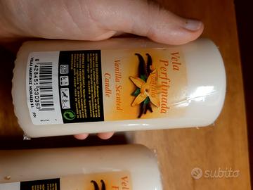 Vendo candele decorative profumate alla vaniglia, mai usate. Forma cilindrica. Altezza: 11 cm Diametro base: 5,5 cm