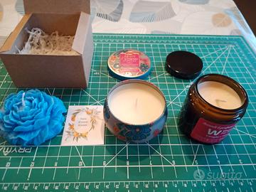 Lotto composto da 3 pezzi: 1 candela artigianale a forma di peonia profumazione essenza all'arancia 1 candela con barattolo in latta Tesori d'oriente Ayurveda con olio essenziali 1 candela con barattolo in vetro Komorebi Candles profumazione vaniglia e mandarino. Nuove perfette in tutto. Il prezzo indicato si riferisce all'intero lotto composto da 3 candele.