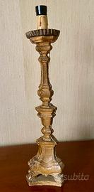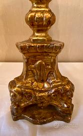 Candeliere antico in legno dorato e finemente intagliato. In epoca successiva è stato elettrificato e arricchito da un bellissimo paralume. Il candeliere è in condizioni molto buone com’è possibile constatare dalle foto allegate. Riporta normali difetti e mancanze dovute alle tracce del tempo. L’impianto elettrico è datato e quindi da mettere a norma. Altezza totale cm. 95 - altezza solo candeliere cm. 66 - diametro paralume cm. 38