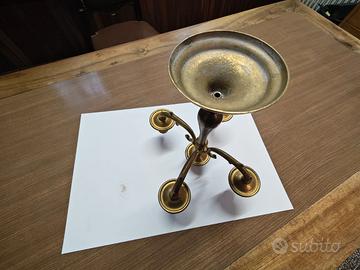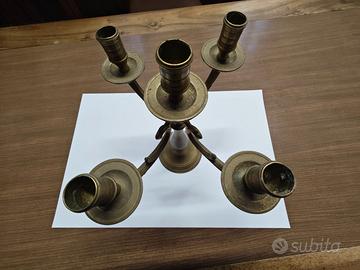 Candeliere in ottone pesante a 5 luci, oggetto degli anni "50 del secolo scorso. Portacandele in ottone in stile: grande decorazione vintage, perfetto per un tavolo da pranzo o da esporre sul caminetto. Si tratta di un pezzo bellissimo e di alta qualità, molto pesante, realizzato in ottone/bronzo. Condizioni: buone condizioni vintage/antiche, con segni di usura dovuti al tempo. Foto e video fanno parte delle nostre descrizioni, per una visione migliore. Altezza: 27 cm., diametro 25 cm., Peso kg. 1,040.
