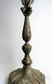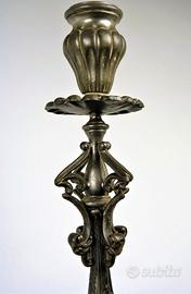 Vecchio e originale candeliere in peltro lavorato a sbalzo con motivi floreali e conchiglie marine con base circolare.
