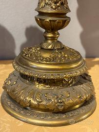 Coppia di candelieri francesi in bronzo dorato dell’Ottocento, a cinque luci, riccamente cesellati. Presentano fusto centrale con bracci mossi decorati a volute e motivi fogliacei, tipici del gusto Luigi XV revival. Base circolare ampia con ornamenti floreali in rilievo e doratura calda e uniforme.