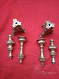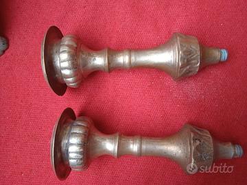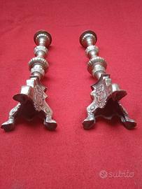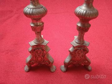 coppia Candelieri stile Gotico con punzone epoca 1800, in bronzo, base tripode con disegno floreale e riccioli laterali tutto in rilievo, asta centrale con pomi con sfaccettature finale con piattino fisso e sfaccettature verticali, sono in buone condizioni generali, smontabili in 3 sezioni. misura altezza cm 31, base tripode 8,5 x 8,5, diametro piattino 5,5, profondità piattino cm 1,5, piccolo punzone cm 1,3 peso grammi 496 cadauno.