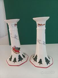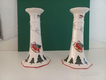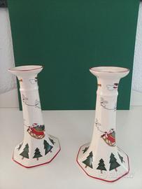 Coppia di Candelieri Mason's Christmas Village, vintage, porcellana decorata con scene natalizie , babbo Natale su una slitta e alberi di Natale, oggetto da collezione