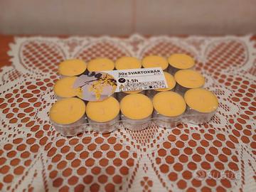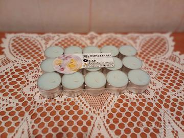 Candeline profumate in una fresca fragranza di mimosa ( giallo), limone ( verde chiaro), fragola (rosa). Materiale: Portacandela (alluminio); Candela ( cera di origine vegetale min 50%, cera di paraffina; Stoppino ( cotone). Tempo di combustione 3,5h. Misura: diametro 3,8 cm. Istruzioni: Solo per uso domestico. ( 1 Cf = 30 candeline). Disponibili 3 Cf.