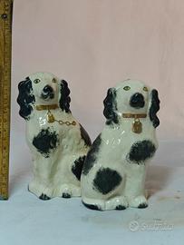 Coppia di cani in porcellana Staffordshire. Oggetti decorativi molto popolari In Inghilterra e in Scozia nel 19° secolo. Questi sono prodotti a inizio '900