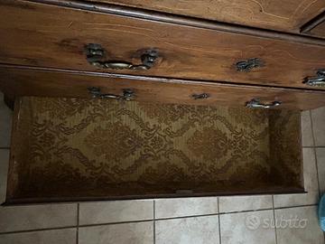 Canterano piemontese prima metà 700' dal design classico ed elegante, con intarsi in bosso, dotato di tre ampi cassetti centrali e due cassetti più piccoli nella parte superiore. Presenta leggeri decori color oro che ne arricchiscono lo stile, rendendolo adatto a diversi ambienti: camera da letto, ingresso, soggiorno o anche come mobile contenitore.