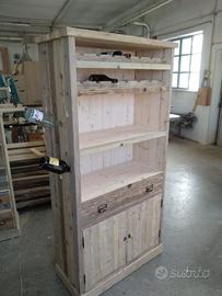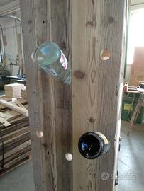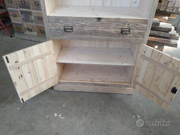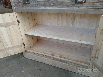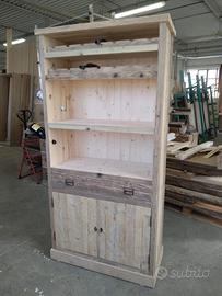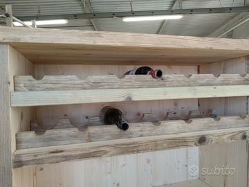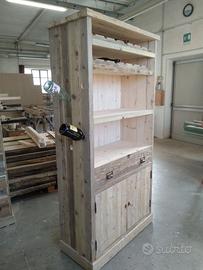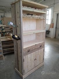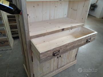Cantinetta in legno vecchio recuperato da solai o parancole da muratore con misure lungh. 200 x 100 prof.45 composta da 2 ante parte sotto a 3 strati con cartelle in legno vecchio venature verticali, interno ripiano aggiustabile in altezza, appena sopra troveremo cassetto su guide in legno con frontalmente e 2 manigliette con segreto incorporato. Schienale da 14 mm in abete nuovo avviato posteriormente e sopra parte a giorno aggiustabile con ripiano e ultimi 2 ripiani con porta bottiglie sagomato per collo bottiglia come pure lateralmente con 6 fori per inserimento collo. Completo di finitura cerata. Iva non comprendente, costruito su commissione, non è disponibile a magazzino ma possiamo riprodurlo DIRETTAMENTE DAL PRODUTTORE ASTENERSI RIVENDITORI O COMMERCIANTI