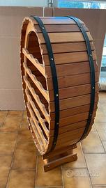 Cantinetta portabottiglie in legno a forma di botte, contiene fino a 24 bottiglie. Altezza 86 cm, larghezza 60 cm, profondità 24,5 cm.