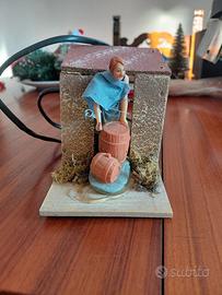 Presepe completo di statuine, animali, forno che si illumina e contadino in movimento.