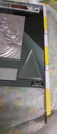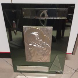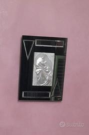 Placca in rilievo in puro argento 925 incastonata in una cornice a specchio di colore bluastro con inserti triangolari e rettangolari. Incluso certificato di garanzia. Misure 50x37 cm.