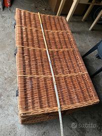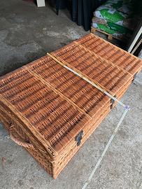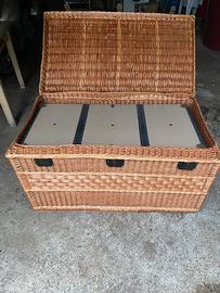 Vendo questo baule in vimini, vintage risalente agli anni 60. Molto capiente e ben conservato, presenta chiusure metalliche sul davanti e maniglioni sempre in vimini, per un facile spostamento. Misure: altezza67 cm larghezza 67 cm e ben 120 cm li lunghezza. Ottimo affare. Non spedisco