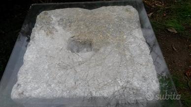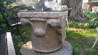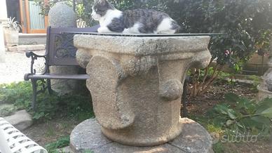capitello in pietra serizzo fatto a mano da abili scalpellini con tre bugnature a firma di giglio su tre lati e porta stemma del casato sul quarto lato . diametro cm 48 . altezza cm 56 . epoca di fattura metà 600 . peso approssimativo 300 kg . pezzo di antichita' da inserire dietro accurata sabbiatura e pulizia in contesti di qualita' con un cristallo di superficie