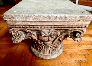 Capitello corinzio in cementino con supporto in cristallo, ideale come tavolino elegante, dupporto piante, libri, fotografie.