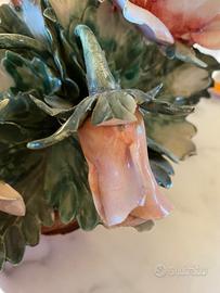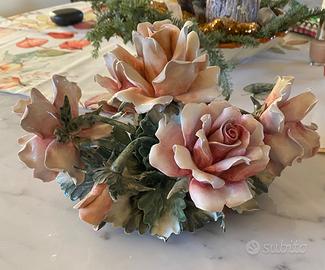 Opera in porcellana di Capodimonte rappresentante un cache pot di rose rosa sulla base si trova impresso il marchio della manifattura: una "N" azzurra coronata. E' un opera d'arte preziosa di altissima qualità, in ottimo stato, ricca di particolari, una composizione di rose fiorite e di boccioli con foglie increspate dai colori delicati. Metà ‘900 Porcellana policroma smaltata. MANIFATTURA: Capodimonte - Nel 1743 a Napoli, nei primi anni della nuova dinastia borbonica, il re Carlo e sua moglie, la regina Maria Amalia di Sassonia fondano all'interno della famosa Reggia di Capodimonte, oggi Museo, la Real Fabbrica dando inizio ad una tradizione ancora viva. Altezza 18 cm Larghezza 25 cm Ottime condizioni, data l'epoca sono presenti piccoli segni del tempo e di utilizzo, segnalo una leggera sbeccatura di foglia a tre boccioli ed un leggero scolorimento di un petalo rosa. Il tutto visionabile attraverso le foto allegate all'inserzione.