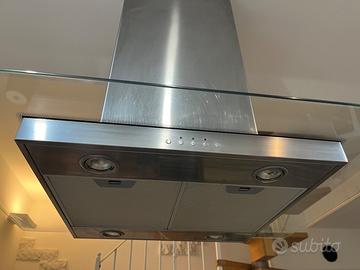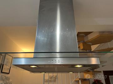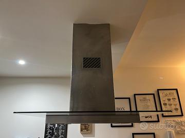 Cappa professionale della faber in acciaio e vetro a soffitto completa . Tre livelli di aspirazione e quattro luci misure altezza cm 80, vetro cm 90x70 . Misura cappa cm 35x30 la parte sotto dove sono luci e grate di aspirazione misura cm 53x52. Perfettamente funzionante