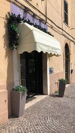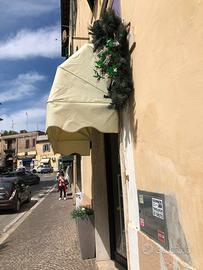 Cappottina parasole da esterno in tessuto beige, ideale per proteggere finestre, porte o vetrine da sole e pioggia. Struttura resistente in alluminio verniciato, leggera ma robusta, con tessuto impermeabile e anti-UV.