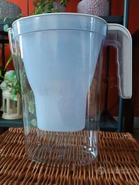Caraffa in robusta plastica trasparente per acqua filtrante marchio BWT, con inserto grigietto opaco e coperchio bianco (escluse cartucce) per poter utilizzare l'acqua di rubinetto da bere ed evitare le bottiglie in platica monouso, riducendo i rifiuti di plastica.