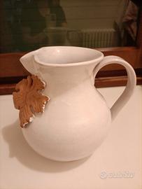 capiente caraffa smaltata bianca decorata con grappolo d' uva e foglia di vite in terracotta grezza, altezza cm. 23, realizzata da F.lli MENNELLA di Casamicciola ( Ischia)