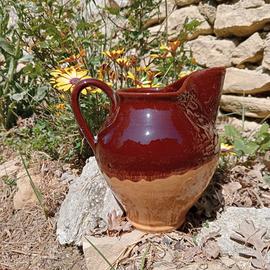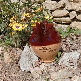 Caraffa in terracotta smaltata, colori marrone nella parte superiore e interiore e color marroncino chiaro nella parte inferiore con scritta netta "La stella del colle" con manico. Altezza cm20 circonferenza cm48.