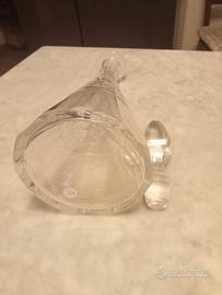 caraffa in vetro spesso utilizzata come decanter per vino o liquori base ampia che si assottiglia verso l alto dotata di tappo abbinato, decorazioni incise sul corpo in vetro,alta cm 40
