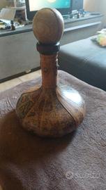 caraffa per il vino rivestita in pelle, decorata con una mappa antica raffigurante il vecchio mondo. Materiale: Rivestimento esterno in cuoio/pelle su base in vetro o altro materiale. Design: Mappa geografica in stile vintage con dettagli calligrafici. Funzione: Progettata per servire il vino o come oggetto decorativo. Dettaglio: Tappo sferico anch'esso rivestito in pelle.