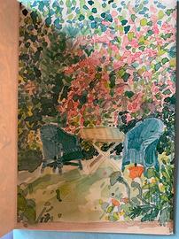 Bellissima card vintage con finestra che si apre su un giardino, con relativa busta.