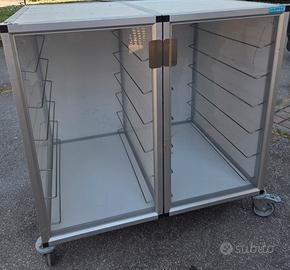 vendo 2 carelli porta vassoio. 12 vassoi in ogni carello. un carello è da riparare o da sostituire le porte ( flexi glass che sono rotti). l'altro carello è in buon condizione. marca hupfer. retiro a mano.