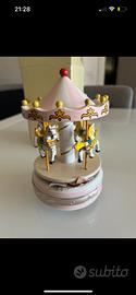 Raffinato carillon a forma di giostra, realizzato a mano in legno, curato nei minimi dettagli e impreziosito da lastre decorative in argento silver.
