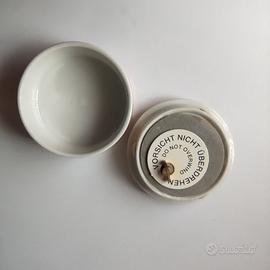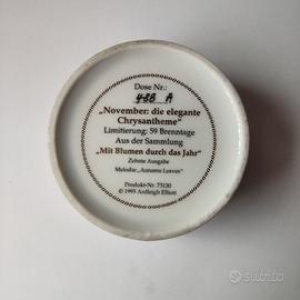 Carillon Porcellana Ardleigh Elliott - "Novembre: l'elegante Crisantemo" (1995) Raffinata scatola musicale (carillon) in porcellana artistica, parte della celebre serie limitata "Mit Blumen durch das Jahr" (Un anno tra i fiori) di Ardleigh Elliott. Soggetto: Novembre - L'elegante Crisantemo ("November: die elegante Chrysantheme"). Melodia: "Autumn Leaves" (Foglie d'autunno), un tema perfetto per il mese di novembre. Meccanismo musicale perfettamente funzionante. Dettagli: Splendida illustrazione floreale nei toni dell'arancio e del giallo sul coperchio, con bordatura decorata in oro e verde. Condizioni: Eccellenti condizioni vintage, porcellana integra senza segni di usura, crepe o sbeccature. Autenticità: Edizione limitata (n. 488 A). Marchio originale sul fondo datato 1995. Dimensioni: Diametro 6.5 cm, Altezza 3 cm. Un pezzo di classe per arricchire una collezione o come idea regalo per chi è nato a novembre. Analisi dell'oggetto Periodo e Origine Anno: 1995. Serie: Si tratta della "Zehnte Ausgabe" (Decima uscita) della collezione. Rarità: Il numero di serie 488 A è piuttosto basso, il che è un piccolo valore aggiunto per un collezionista attento, poiché indica uno dei primi pezzi prodotti in quel ciclo di cottura. Caratteristiche Melodia: A differenza del precedente, questo carillon suona "Autumn Leaves", una melodia molto amata e malinconica che si sposa benissimo con il tema autunnale del fiore. Stato di conservazione: Dalle foto, l'oggetto sembra tenuto molto bene. L'etichetta di avvertenza sul meccanismo ("Do not overwind") è ancora presente e pulita, segno che non è stato manipolato eccessivamente.