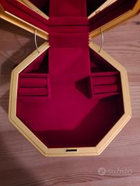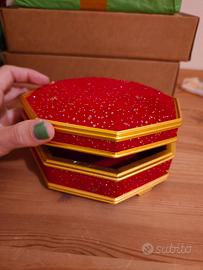 Carillon portagioie rosso che risuona la melodia "Sens in the clowns". Senza batterie a ricarica meccanica. Dalla foto del fondo è possibile vedere la manovella di ricarica del carillon