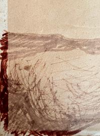 Trattasi di sanguigna realizzata nel 1926 firmata di pugno dall’autore sul retro e dovrebbe collocarsi nel suo periodo” trascendente” che l’artista ha iniziato nel 1922. Raffigura uno studio di mani maschili in varie età, da bimbo e da adulto, aperte , con un piccolo fiore in basso e altra chiusa stringendo una serpe e uno strumento appuntito. Il disegno risulta montato su una cornice, forse non coeva, tipo “fiorentino” a oro figlia del formato 62cm x 52 cm. Verosimilmente incorniciato nella prima metà del ‘900 in quanto in basso a sinistra il bordo del disegno coperto dal passe-partout risulta con un colore più acceso rispetto all’intero disegno ( vedi dettaglio in foto). Questo lavoro a sanguigna è stato donato a mio nonno quando aveva una importante sartoria nel comasco e ebbe l’occasione di conoscere personalmente l’artista.