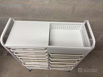 Bellissimo carrellino con ruote a 14 cassetti bianchi estraibili, la struttura è in acciaio laccato bianco e i cassetti sono in pvc bianchi scorrevoli molto resistenti.