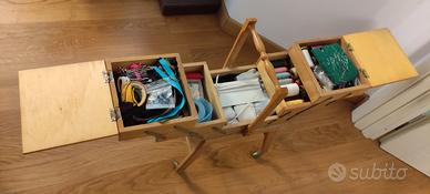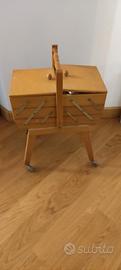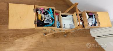Un gioiellino di altri tempi di legno chiaro, artigianale, con rotelline scorrevoli e aperture laterali con cassettini apribili adatti a contenere tutto quello che serve per lavori sartoriali e al tempo stesso anche di arredamento .