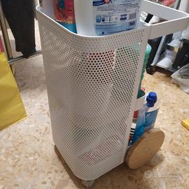 in metallo bianco e ruote in legno. Perfetto per il bagno o la cucina. dimensioni: altezza 58cm larghezza 31 cm profondità 37cm Consegna a mano su Roma. preferibilmente zona Cinecittà o Tuscolana.