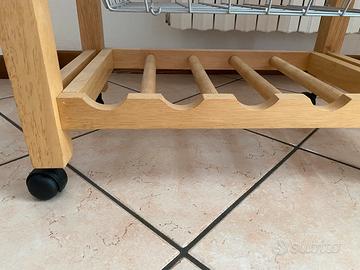 Carrellino da cucina o dispensa in legno naturale, dotato di un pratico cassetto superiore, due cestelli in metallo estraibili ideali per frutta e verdura, e una base con alloggi per bottiglie. Dotato di ruote per spostarlo facilmente.