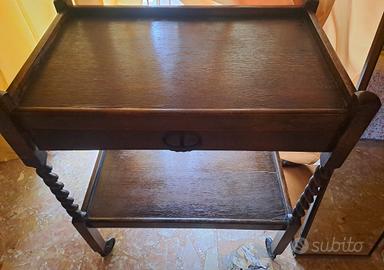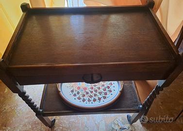 tipica del dopoguerra. • Piani: Due ripiani sovrapposti, spesso bordati per evitare la caduta degli oggetti. Il ripiano superiore è usato per servire bevande o dolci, mentre quello inferiore può contenere bottiglie, bicchieri o un vassoio. Funzione e stile: