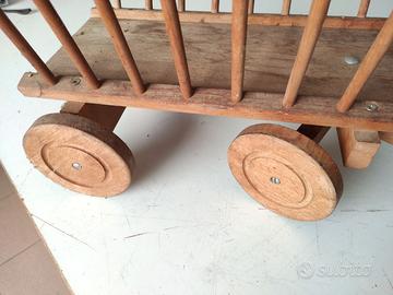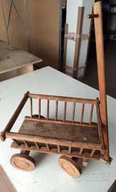 Simpatico carrellino in legno, dimensioni 50X30x30 braccio escluso (smontabile per il trasporto). Ruote girevoli, quelle davanti con perno. Condizioni molto buone, basta solo un po' di cartavetrata e vernice/impregnate per farlo nuovo. Alcune idee: porta riviste in salotto country, porta ciocchi per il caminetto, porta vasi per il giardino. Inizialmente era un vero e proprio giocattolo anni '60! Consegna a mano o spedizione tramite Fedex/TNT, fatemi sapere per altre informazioni