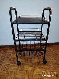 Vendo carrellino per cucina in metallo resistente a ripiani in griglia, con il cesto portaoggetti in basso scorrevole, colore nero, con rotelle per facilitare lo spostamento, ideale per organizzare la tua cucina o altri spazi. E’ usato ma in perfette condizioni. Misure in cm: larghezza 40, profondità 32, altezza 80.